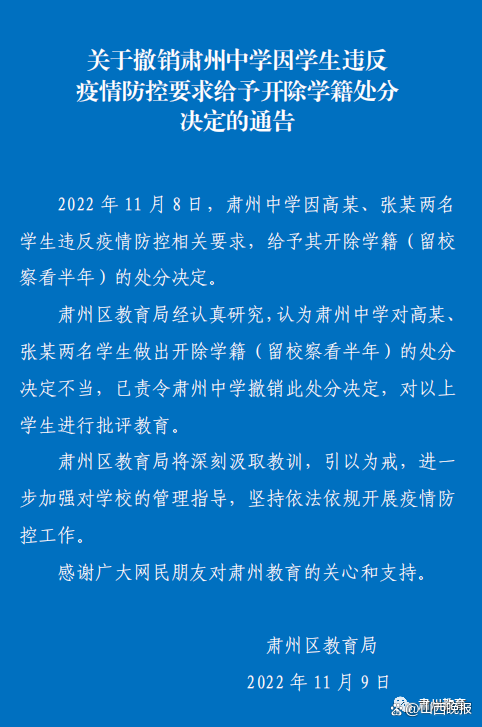 11月9日,肃州区教育局发布“关于撤销肃州中学因学生违反疫情防控要求给予开除学籍处分的通告”: